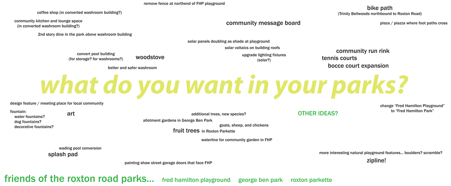 A big thanks goes out to Melodie Coneybeare who took on a huge chunk of work putting together these wonderful vignettes for the meeting. Images are worth a thousand words as the saying goes. Please have a look at the images and continue the conversation about what you would like to see happening in our parks via our Get Involved page!