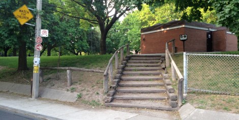 We are receiving funding for this ramp from the AODA fund that pays for greater accessibility for people with disabilities. The stairs are being paid for our of SOGR Capital Funds. The closer the ramp connects to the washroom the better for accessibility it will be. This goal also provides us with more room in the middle of the park for future projects. There is some extra money for the second ramp, but it will more likely not happen until next summer.