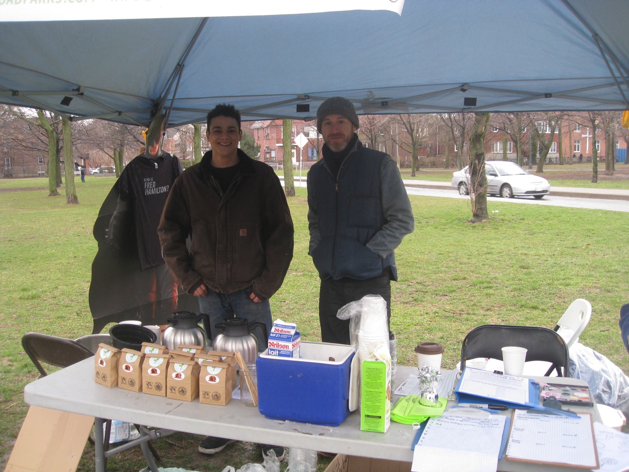 On Saturday April 13, FoRRP joined in the events of Environment Day at Trinity Bellwoods Park. In spite of the rain and extreme cold people’s spirits were high. We served and sold our new organic, free-trade, cafe feminina coffee “Fred’s Favourite Blend” to great enthusiasm. Thanks to Ryan and Rene of Dark City Coffee for their delicious custom blend and for roasting it up for four hours in the rain and cold. “Fred’s Favourite Blend” will soon be for sale on our website!