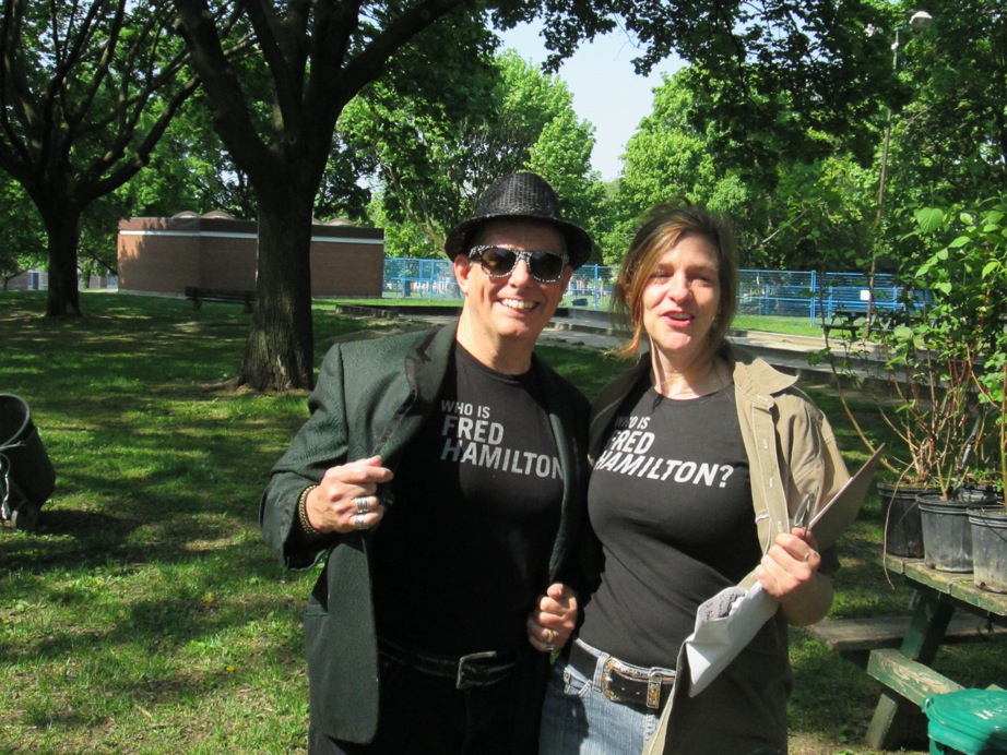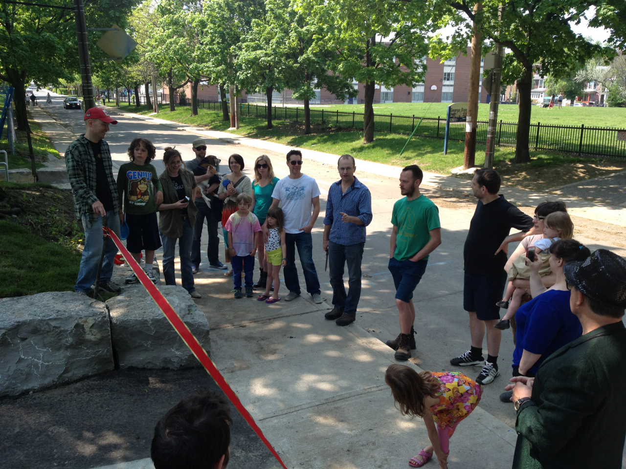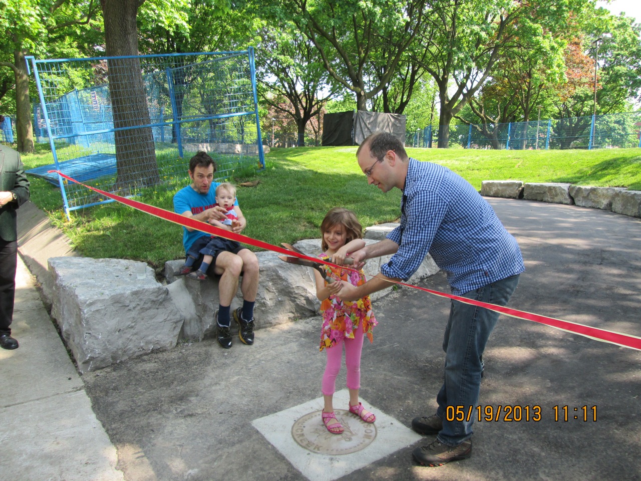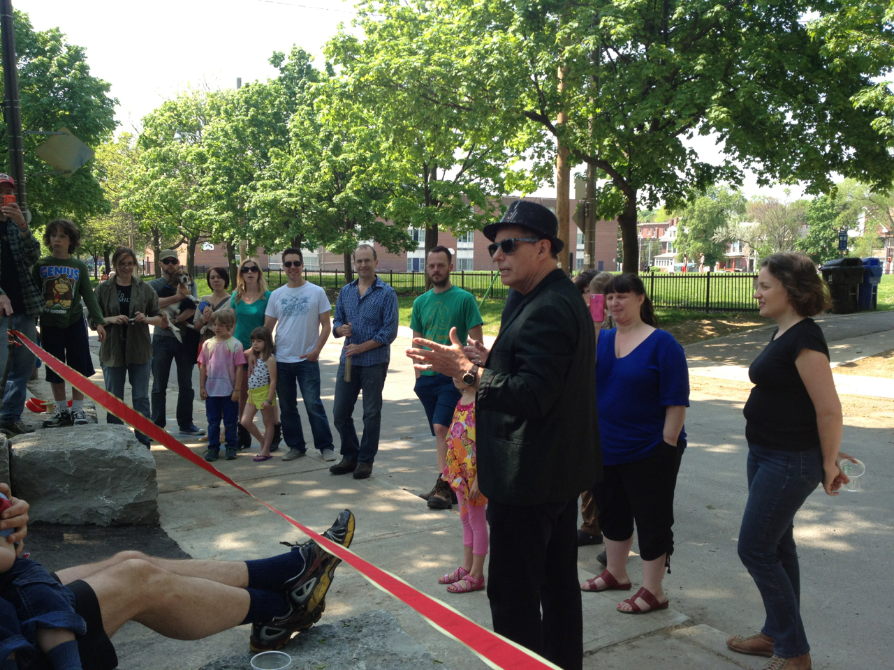 The new accessibility path and stairs for Fred Hamilton Park is a beautiful and functional walkway connecting George Ben Park and Roxton Road with the upper part of Fred Hamilton Park and the washroom building. No more crumbling steps and muddy tracks! Fencing will stay up a bit longer to allow the new turf to get established. As you’ll see in the photos below, the retaining stones on both curves of the path will make for lovely additional park seating as well – a bonus. Special thanks to Councillor Mike Layton, who not only attended the ribbon-cutting, but rolled up his sleeves and did some clean-up and tree planting as well!