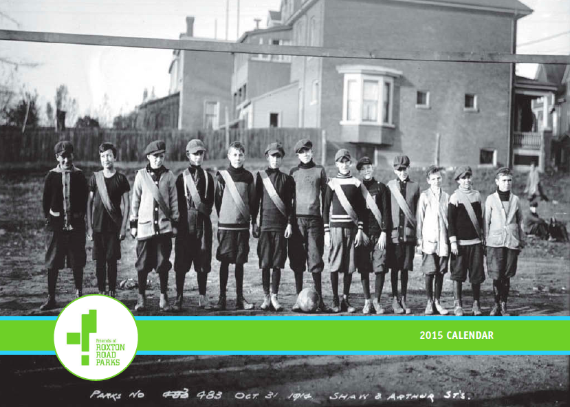 The 13-month calendar includes historical images and maps from the City of Toronto Archives and the Toronto Public Library showing our parks, streets and neighbourhood in the early 1900s. Photos include digging the Garrison Creek sewer, sledding in Bellwoods Park, a local cottage that survives today from before the creek was buried and the cover features a soccer team photo taken at Dundas and Shaw streets in 1914.