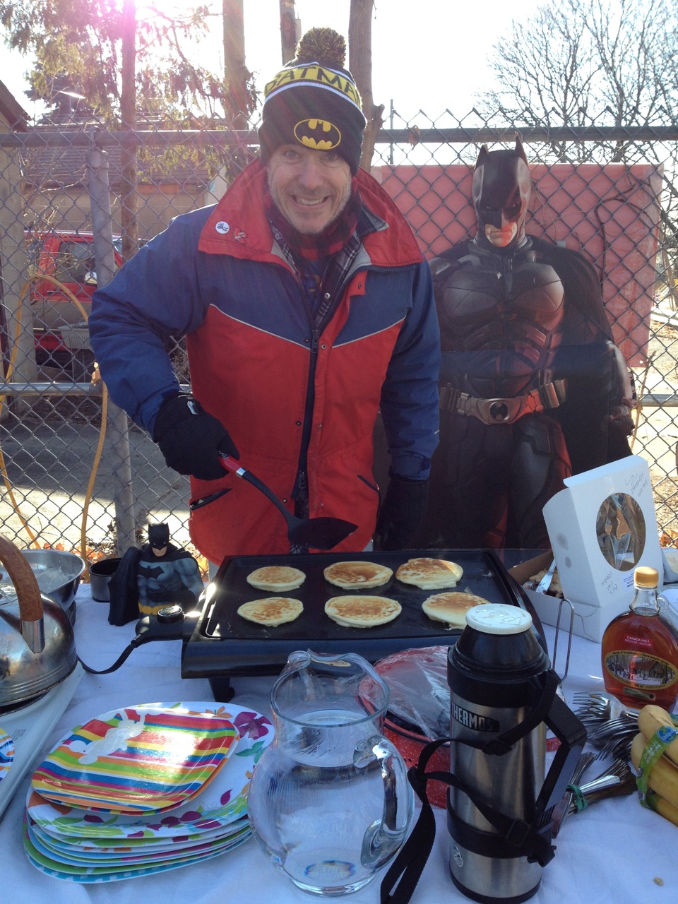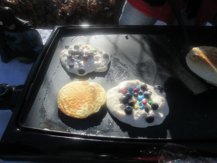 It was a mild (compared to last year!) bright sunny day. Pancakes made from Jill’s delicious batter were served with organic blueberries, bananas, and mini M&Ms by Tim who demonstrated his polished pancake making technique.