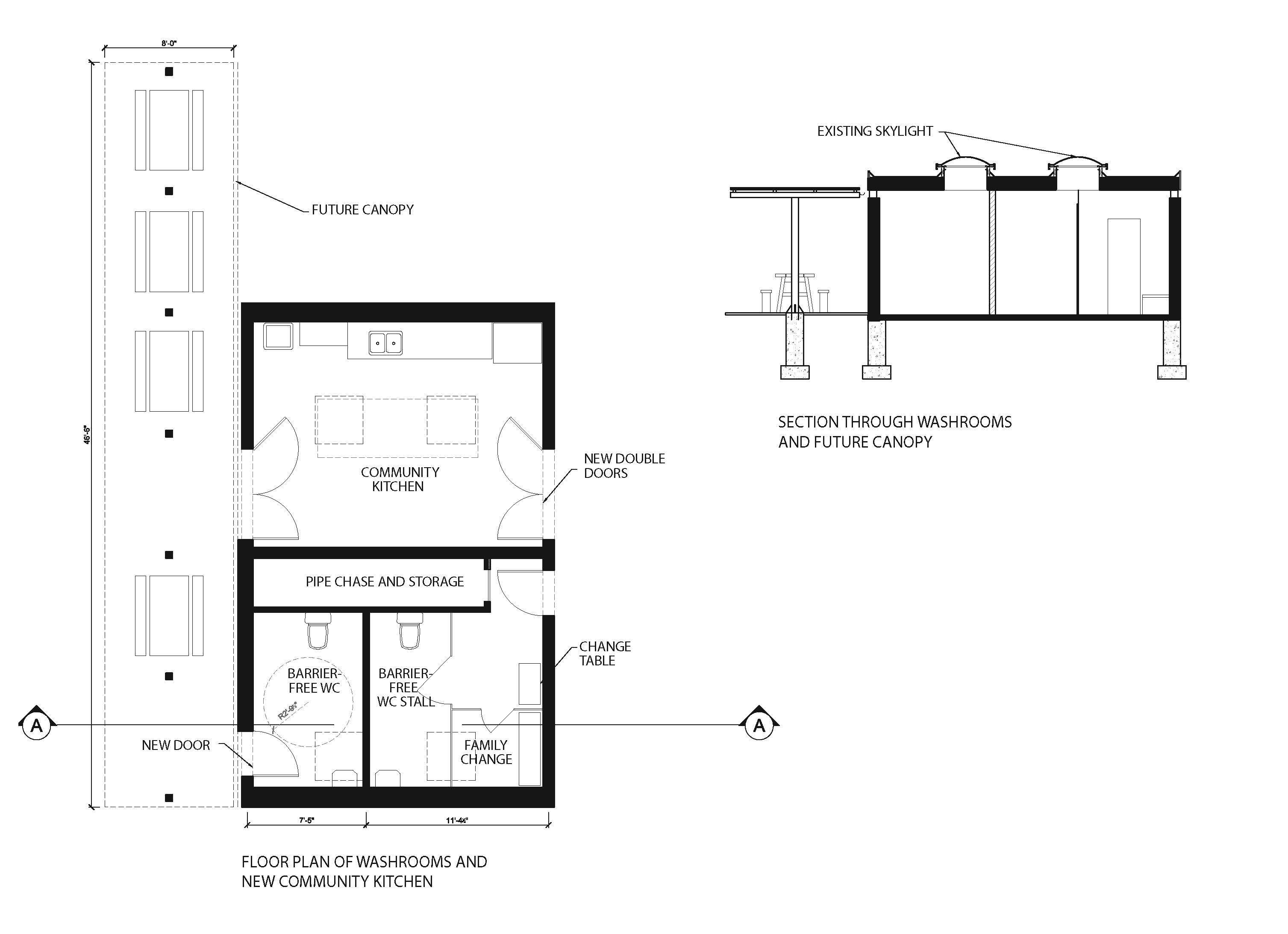 The men’s side of the washroom will be turned into 2 barrier-free unisex washrooms and one small changing stall (for our wading pool users). The women’s side of the washroom will become a very simple kitchen facility and space for modest community gatherings.