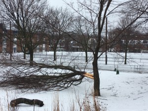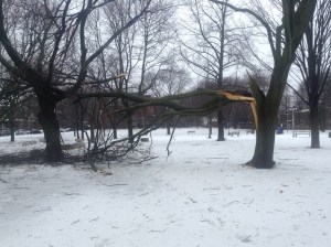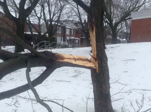 Tree damage: Sadly, three large trees in Fred Hamilton park, two in the north side and one in the south near the playground area, suffered major damage over the weekend during the terrible Spring storm. As of Monday morning, a cleanup crew was on site removing the damaged branches of the tree closest to the road on Shaw Street.